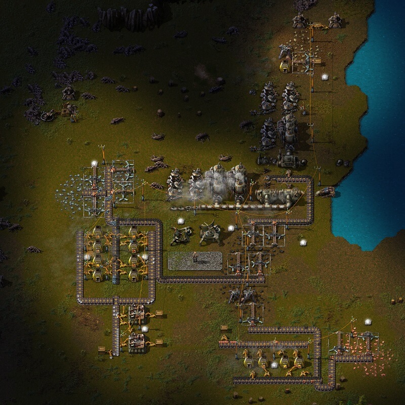 Путь к величию начинается с самого унизительного — ручной добычи ресурсов. Камень, уголь, железная руда, медная руда извлекаются вашими собственными руками. Затем наступает момент озарения: почему бы не делегировать эту работу машинам? Плавильные печи трансформируют сырьё в пластины. Шахтные комплексы функционируют в автономном режиме. Энергосистема, состоящая из насосов, котельных и паровых турбин, питает всю инфраструктуру электричеством.