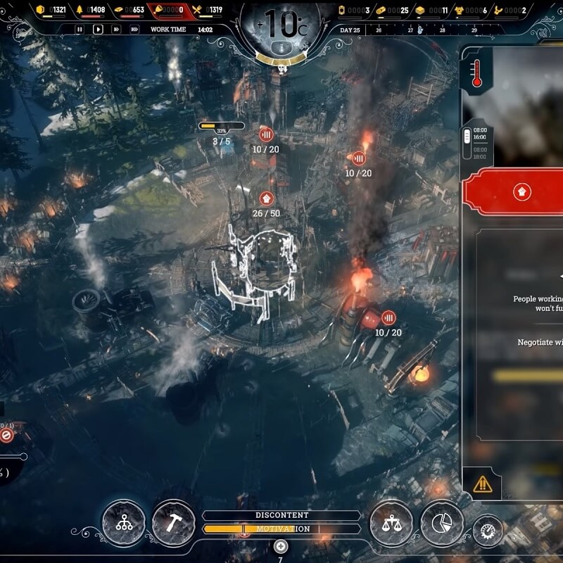 Возводите жилые комплексы, промышленные объекты (в первую очередь угольные разработки), медицинские учреждения, столовые и приюты. Но помните: каждое здание требует ресурсов, каждый ресурс — труда, а каждый труд имеет цену в виде человеческих жизней и моральных компромиссов.